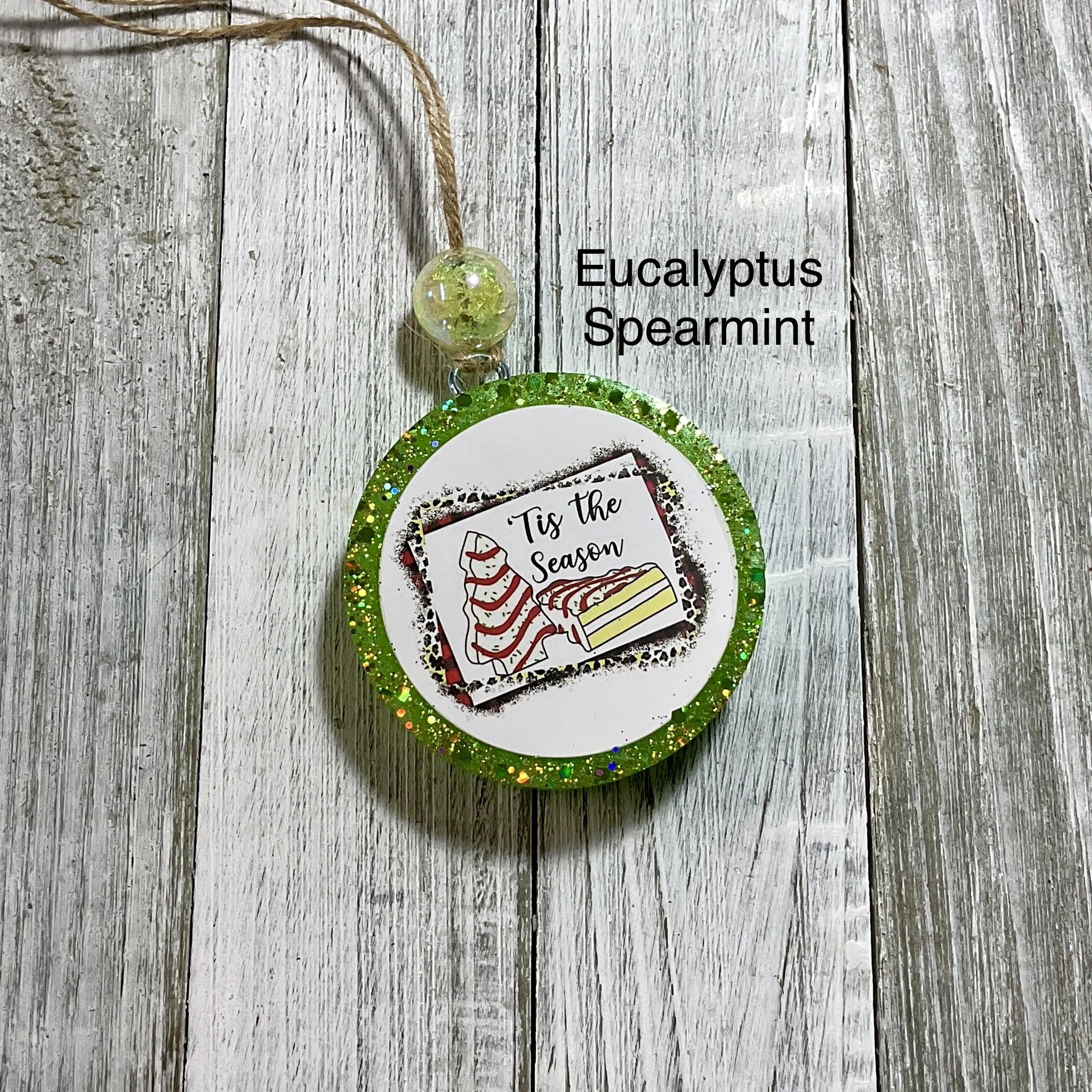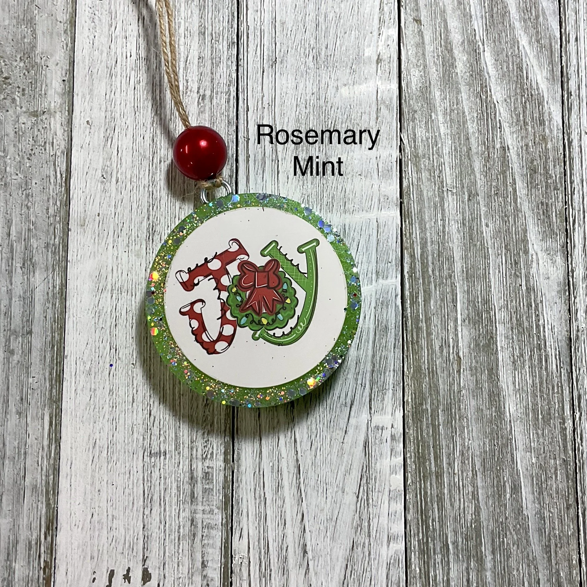 This Joy Christmas freshie is scented in Rosemary Mint. The Freshie has glitter and a decorative bead on top.