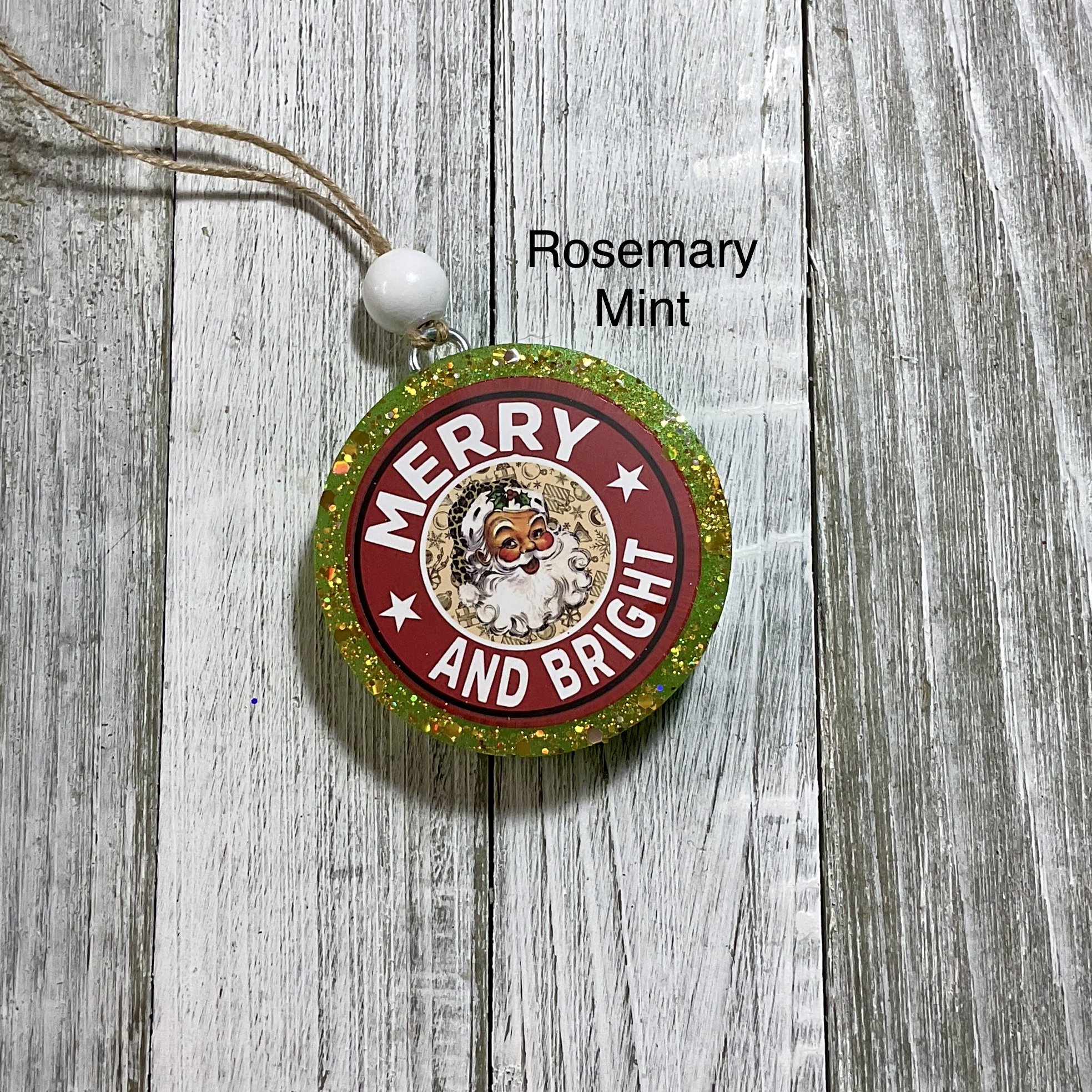 This Merry & Bright Santa freshie is scented in Rosemary Mint. The Freshie has glitter and a decorative bead on top.